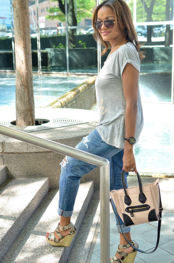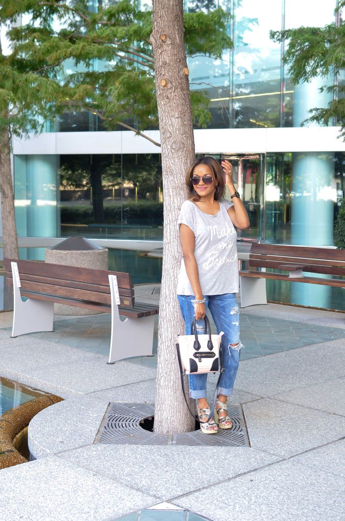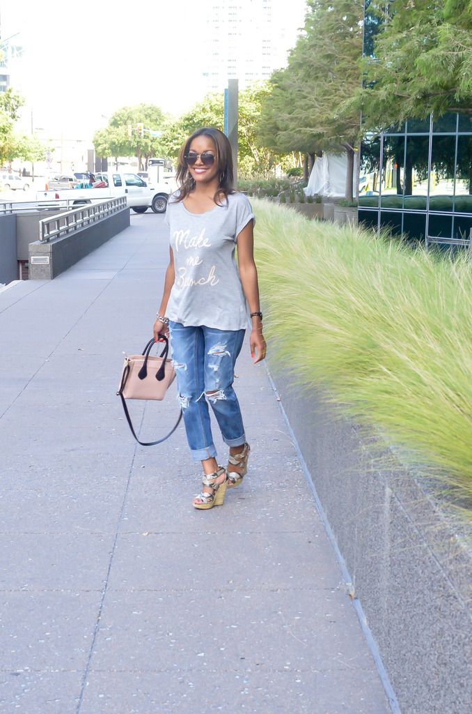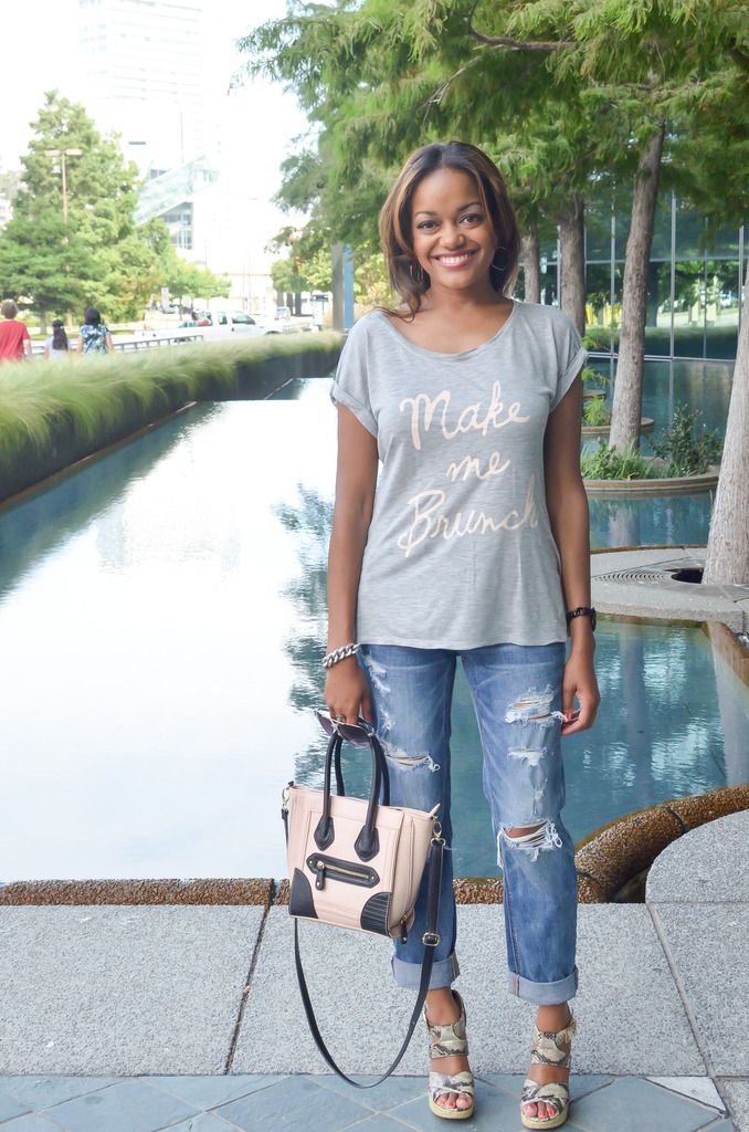 I don't know about where you live, but here in Dallas we are serious about our brunch!!! I absolutely love to eat, that coupled with a yummy mimosa and I am down! When I saw this tee at Kohls I knew I had to have it for my brunch attire. For a casual brunch, I like to keep the look easy but make the look a little special with accessories or shoes. I think this outfit definitely fits the bill. A comfy t-shirt and boyfriend jeans to hide all of the pancake, crepe or french toast goodness that I consume. The cute wedges makes me look like my life is together and that I still got it even as a mommy lol. A few of my favorite brunch spots in Dallas are Breadwinners, Whiskey Cake, Del Frisco Grill and Smoke. Definitely check those places out if you're ever in my neck of the woods!