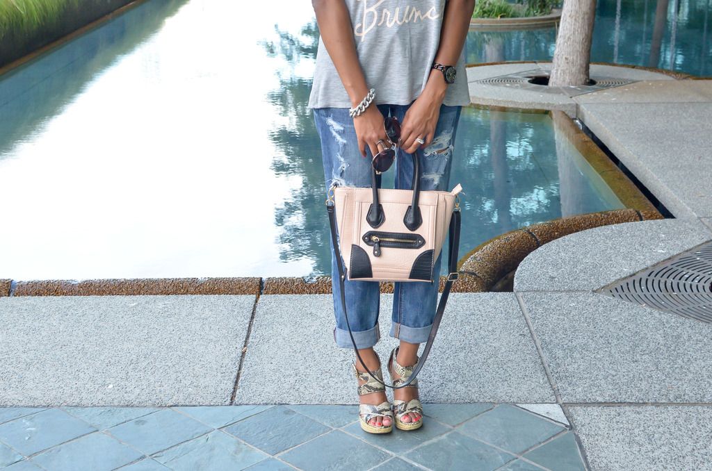 Outfit Details: Brunch T- Shirt- Kohls Jeans- American Eagle and BOGO 50% Off!! Shoes- Steve Madden (old) but here are some super cute ones I love here, here and these wedges right here tho'? Handbag- Aldo (old) Bracelet- Love Andrea's Closet Watch- Michael Kors Earrings- Sole Society Sunnies- Aldo's but craving these Diane Von Furstenburg's!